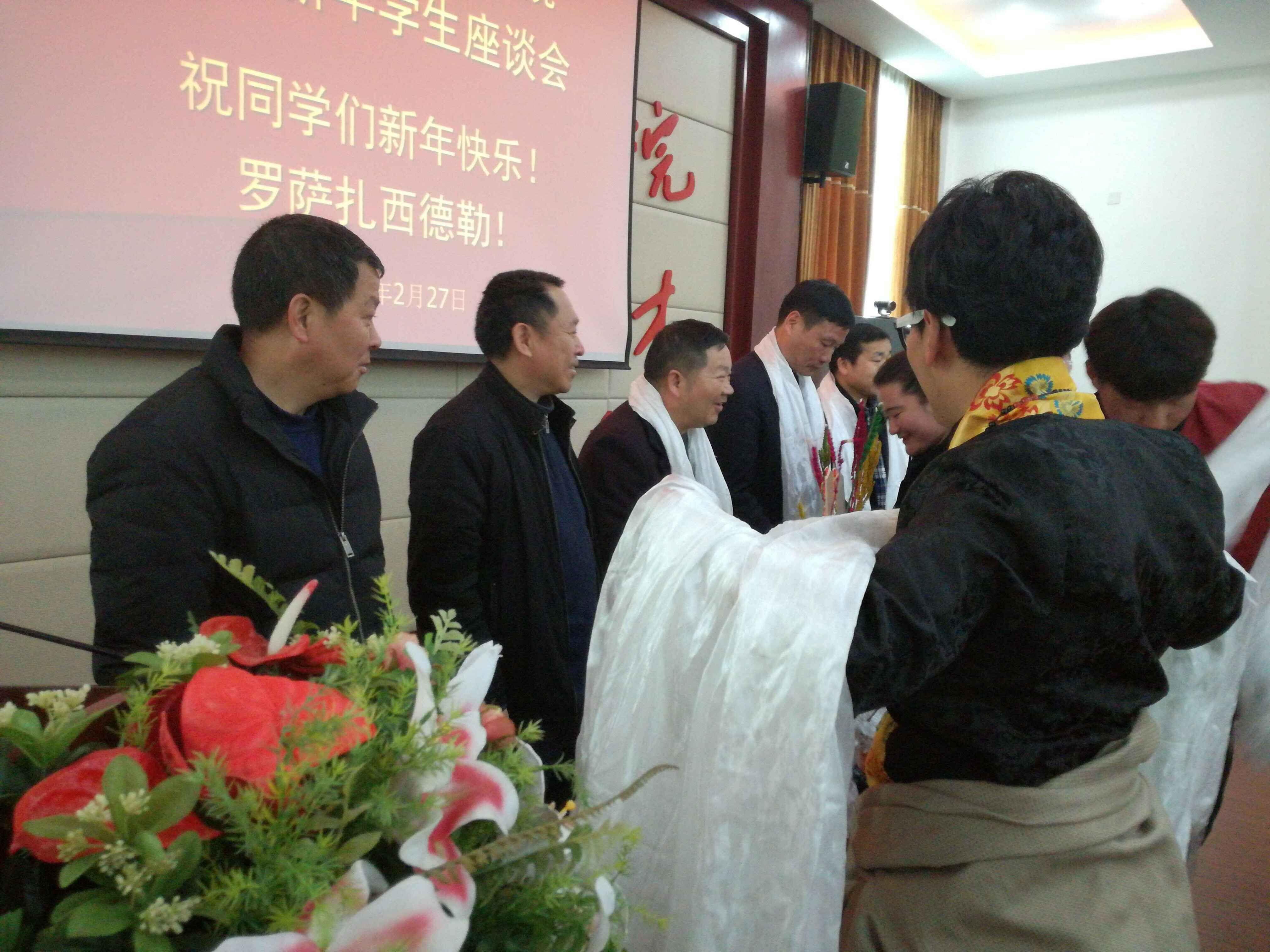 座谈会上,身着传统民族服饰的藏族学生代表向学院领导和老师献上哈达。邬副书记对藏族学生表达了诚挚的问候,祝愿他们度过一个安详平和的藏历新年。学生代表们一一交谈着自己的新年愿望,包括对家庭、对社会、对国家的一些好的设想。很多藏族大一新生都说自己是第一次在外过新年,感谢学院各级领导对他们的关怀。