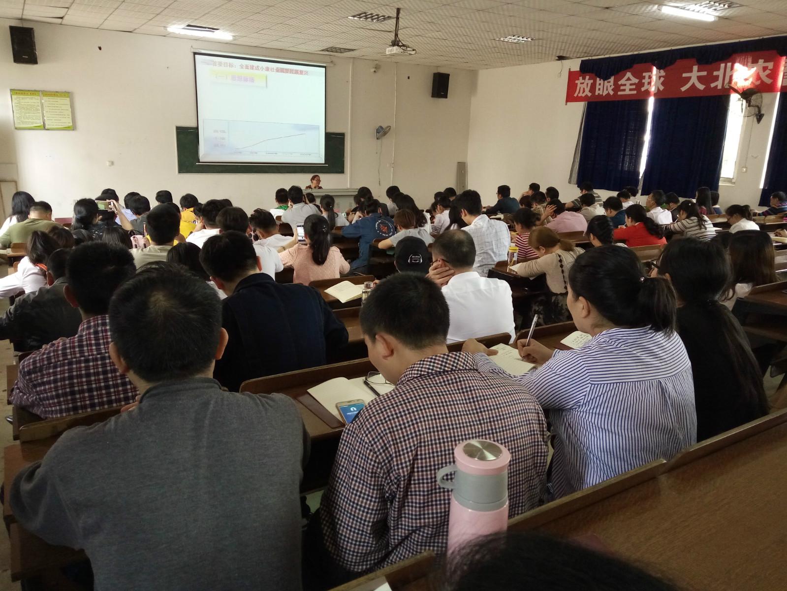 55日下午,我院商贸管理系党支部书记刘新梅在教学楼T1教室给学院七大支部的党员同志们带来了一堂生动的党课——“引领中华民族伟大复兴的战略布局学习领会‘四个全面’科学内涵”。